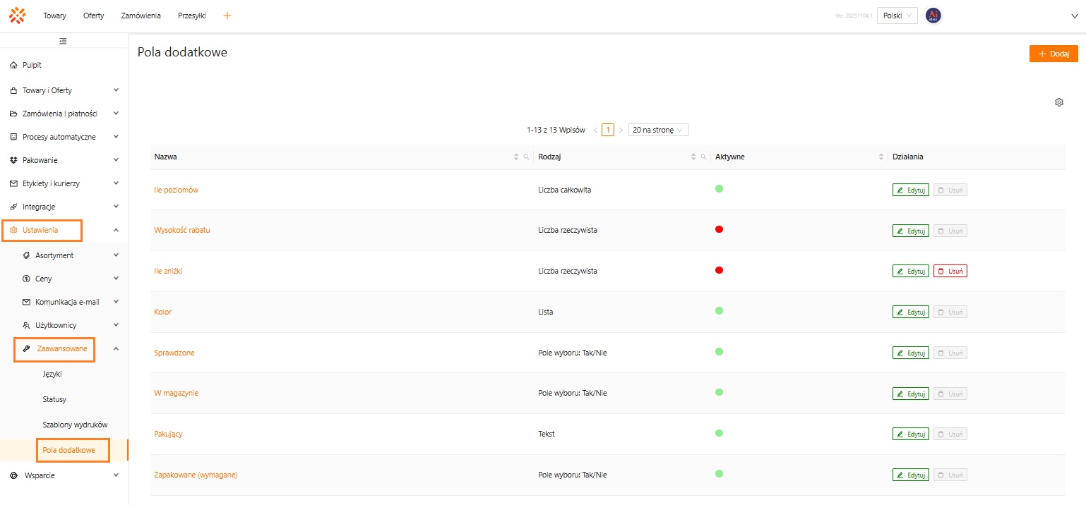 Istnieje możliwość edycji i usuwania dodanych wcześniej pól dodatkowych. Jedynym ustawieniem, którego nie ma możliwości edytować po podaniu pola dodatkowego jest Rodzaj. Pozostałe ustawienia można włączać, wyłączać, a wartości domyślne dowolnie dopisywać.