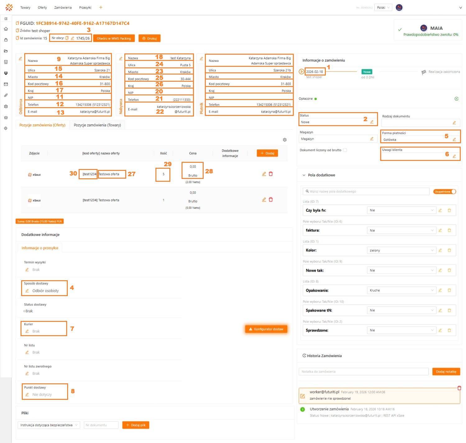 | Edycja zamówienia > Formularz adresu > Odbiorca | 13 | Edycja Zamówienia > Dane podstawowe > Informacje podstawowe | Adres e-mail | 21 | ||