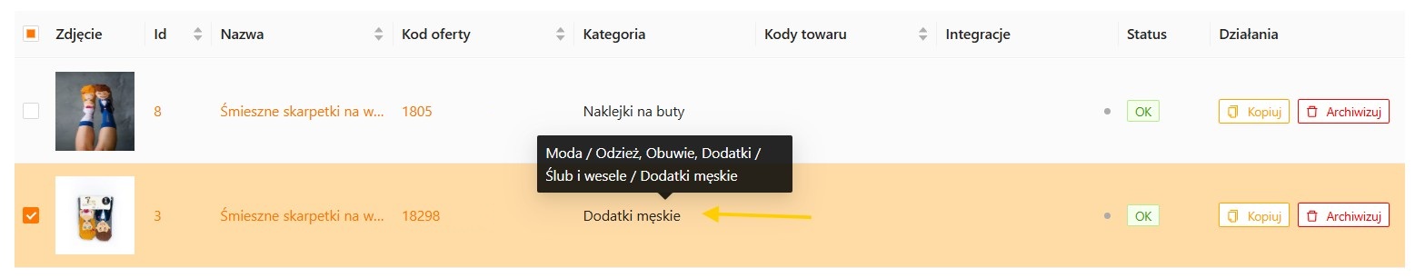 Po najechaniu kursorem na nazwę kategorii wyświetlana jest pełna ścieżka drzewa kategorii, do której należy oferta. Dzięki temu możesz szybko sprawdzić, w jakim miejscu struktury kategorii znajduje się oferta, bez otwierania jej edycji.