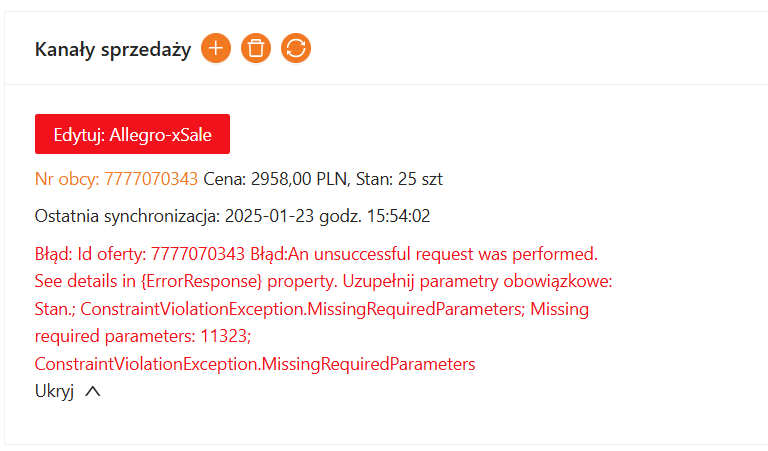- Błąd:Poprzednie zmiany w ofercie wciąż są przetwarzane przez Allegro. Poczekaj z zapisywaniem kolejnych zmian – xSale automatycznie podejmie próbę aktualizacji oferty w ciągu 10 minut.
