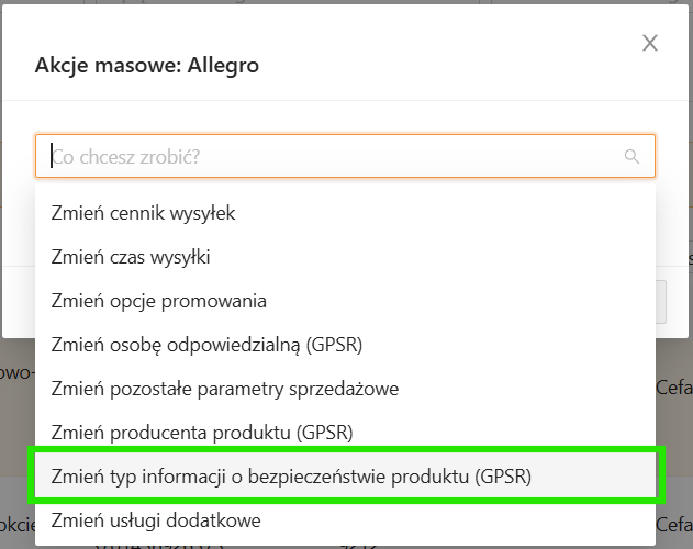 Następnie kliknij opcję Zmień typ informacji o bezpieczeństwie produktu (GPSR), wskaż integracje, dla których chcesz zaktualizować dane oraz wybierz typ, który chcesz ustawić w edytowanych ofertach.