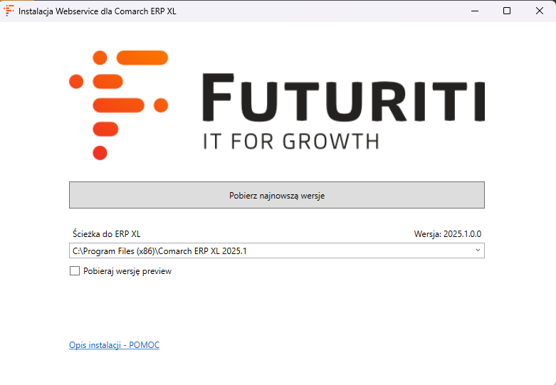 - Aktualna wersja WebService zostanie pobrana do tego samego katalogu co FuturitiWebserviceXLInstallerOne.