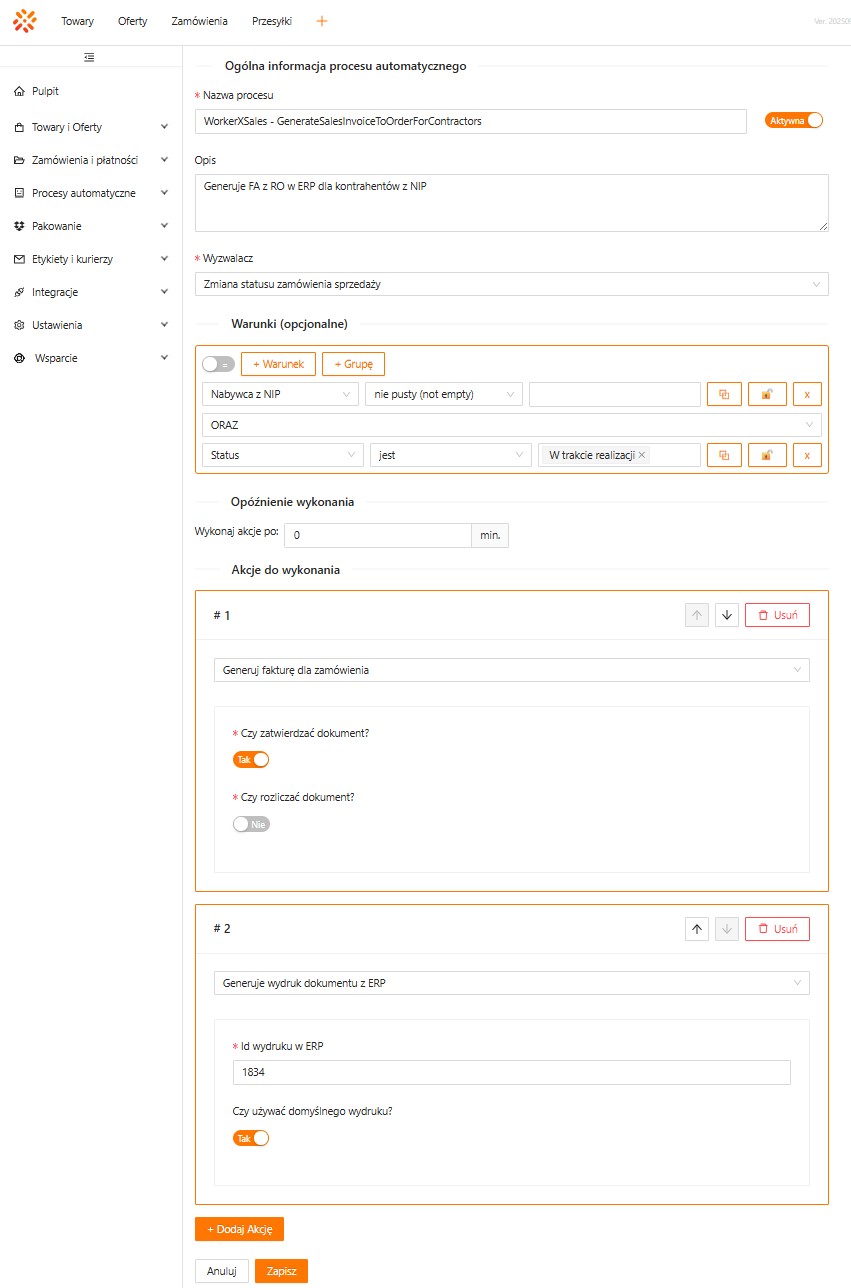 Nazwa procesu automatycznegoWorkerXSales – GenerateSalesInvoiceToOrderForContractors