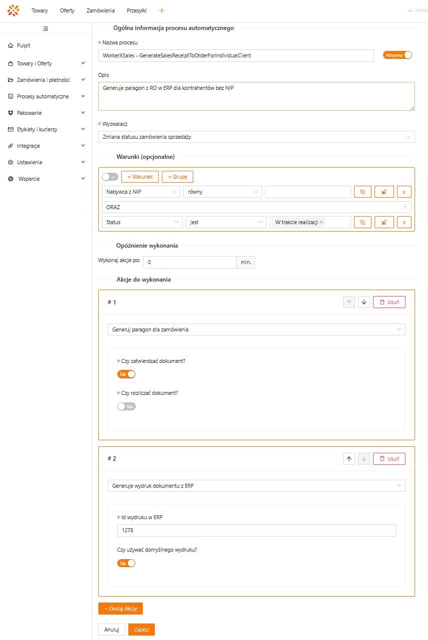 Nazwa procesu automatycznegoWorkerXSales – GenerateSalesReceiptToOrderForIndividualClient