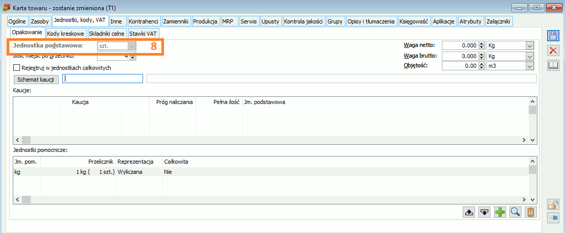| Towary > Edytuj towar | Jednostka główna | 8 | Ogólne > Towary > Edycja karty towaru > Jednostki i kody | Jednostka podstawowa | 8 | |