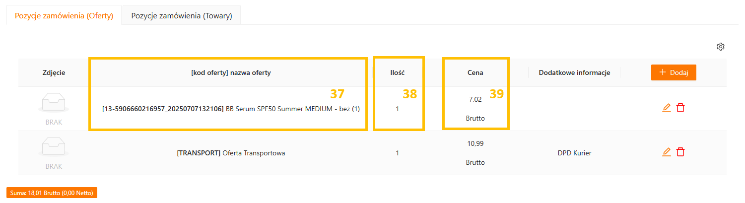 | Edycja zamówienia > Lista przedmiotów zamówienia | Cena | 39 | Edycja Zamówienia sprzedaży > Ogólne | Cena brutto | 9 | |