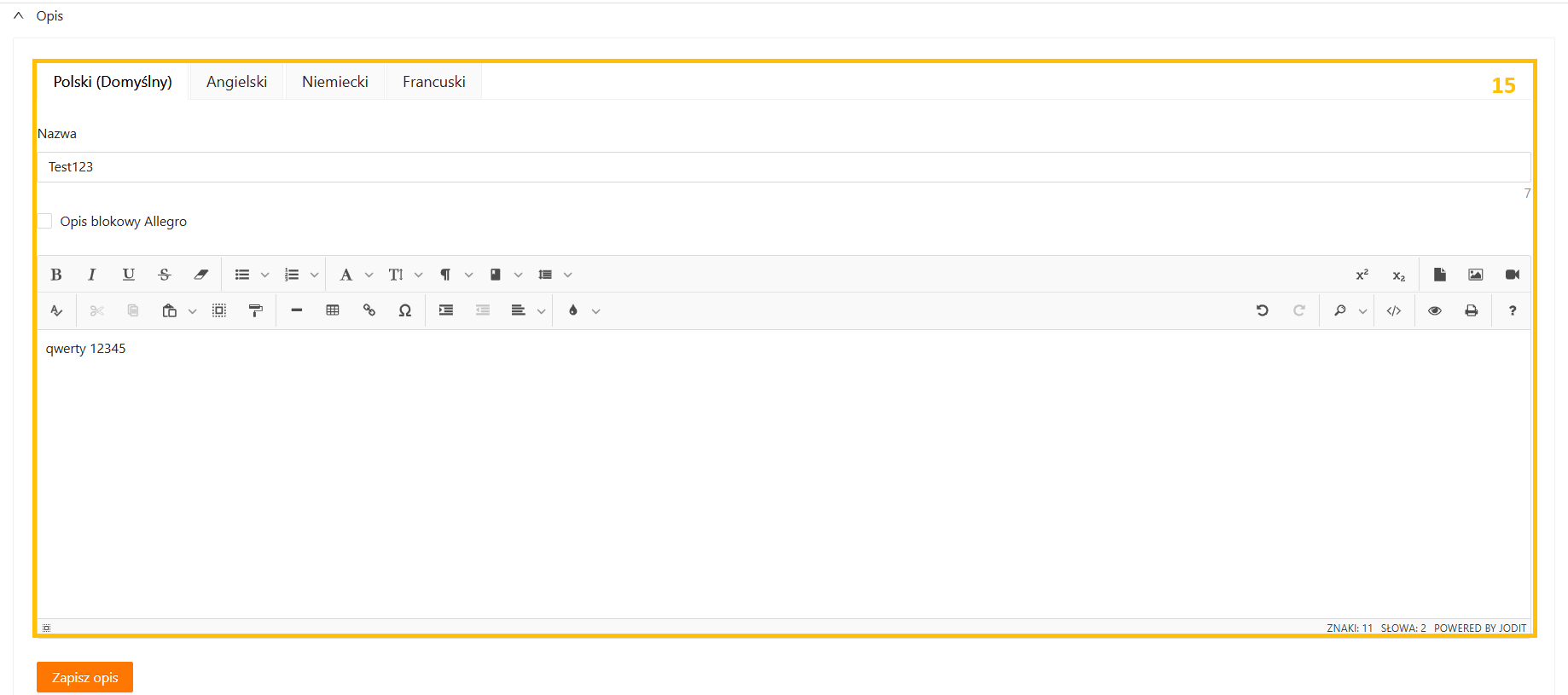 | Towary > Edytuj towar > Opis | Opis w różnych językach | 15 | Ogólne > Towary > Edycja karty towaru > Opisy i tłumaczenia | Tłumaczenia | 16 |