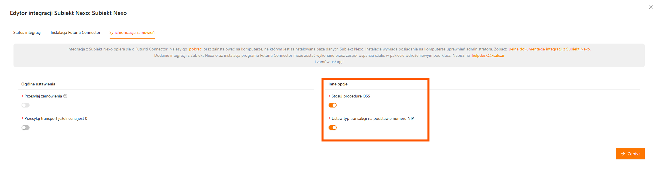 W ustawieniach integracji Subiekt Nexo możliwe jest włączenie trybu z auto-obsługą OSS oraz ustawienie typu transakcji na podstawie numeru NIP.