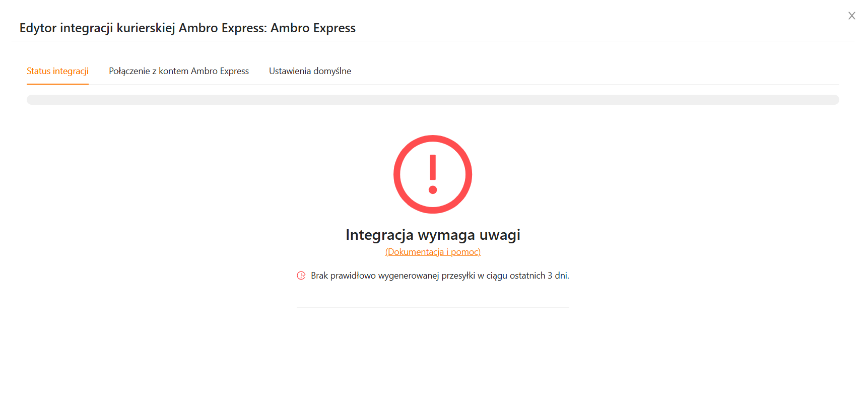 Jeśli sprawdzasz status nowej, dopiero co utworzonej integracji, za pomocą której nie została jeszcze utworzona żadna przesyłka, zobaczysz informację Integracja wymaga uwagi. Podobnie, jeśli w ciągu ostatnich 3 dni nie została utworzona żadna przesyłka z wykorzystaniem danej integracji.