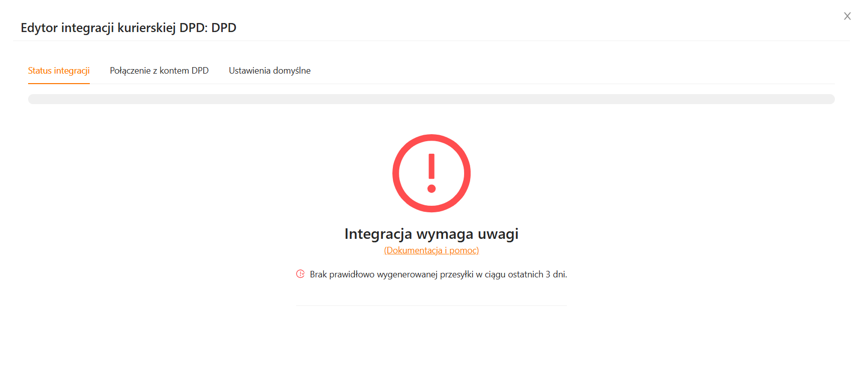 Pierwsza zakładka prezentuje informacje na temat statusu integracji. Tuż po utworzeniu konta zobaczysz tutaj komunikat, że integracja wymaga uwagi oraz wskazówkę, że w ciągu ostatnich 3 dni nie została utworzona żadna przesyłka: