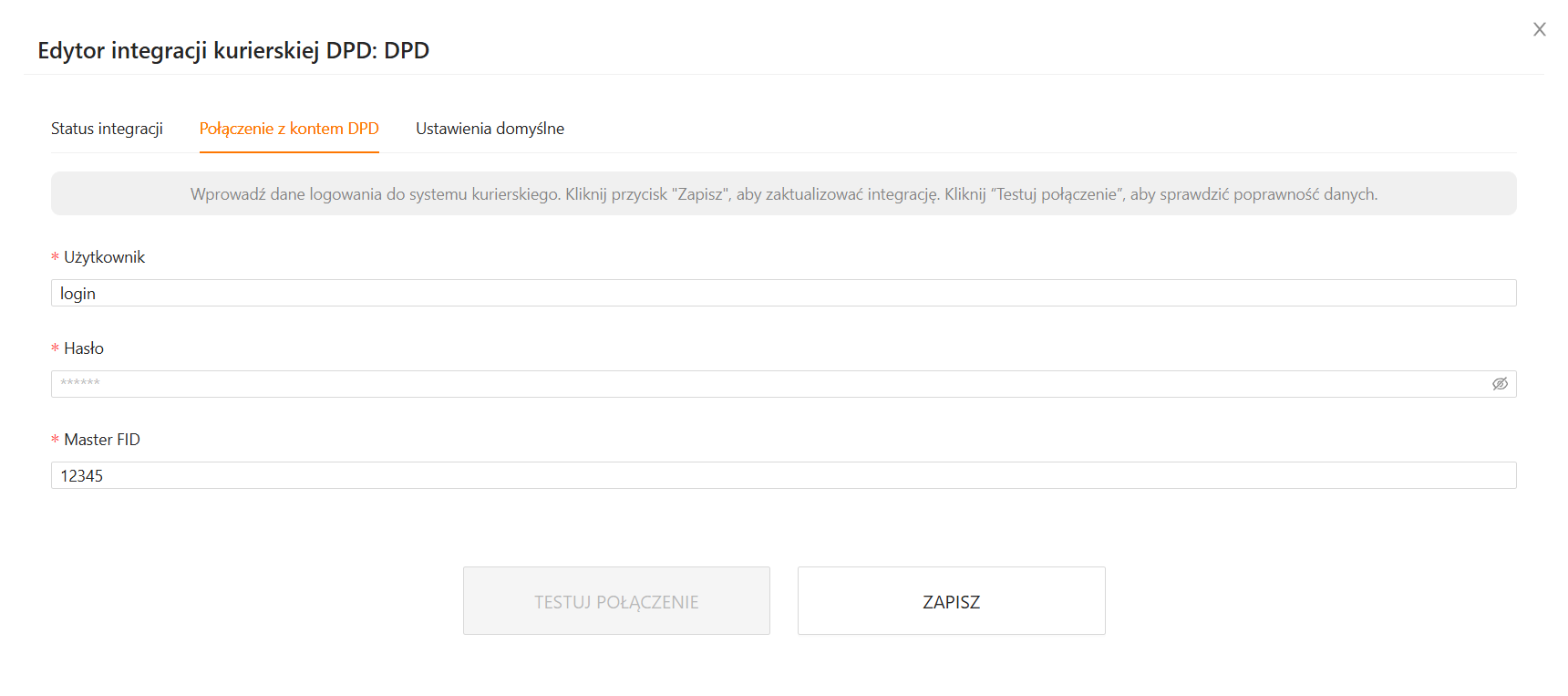 W tej zakładce możesz zmienić dane dostępowe do konta DPD. Po ich aktualizacji (kliknięcie przycisku Zapisz) aplikacja umożliwi ponowny wykonanie testu połączenia z systemem kuriera.