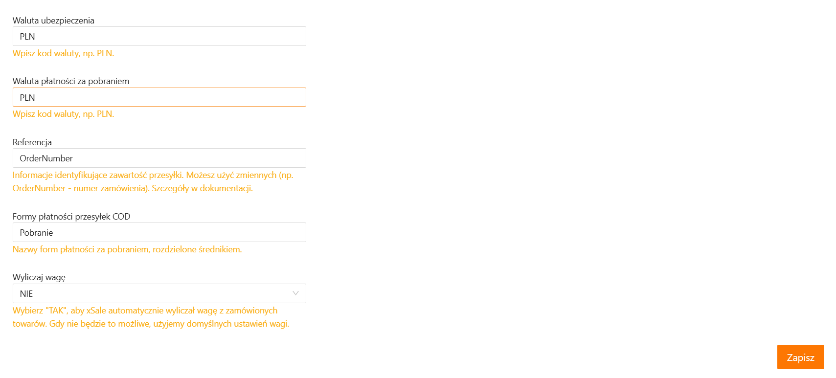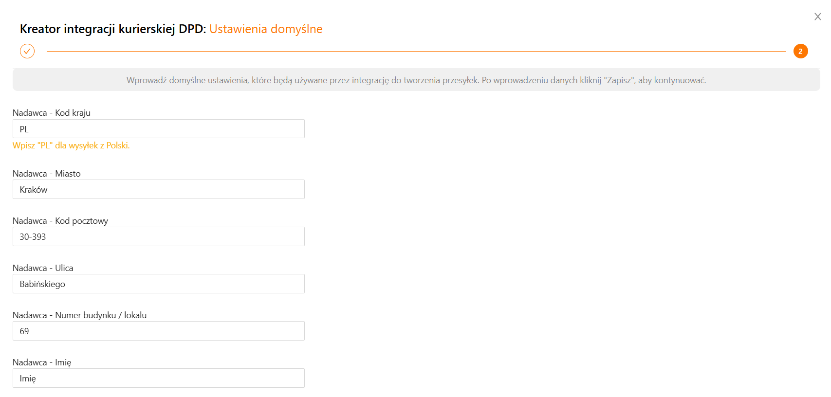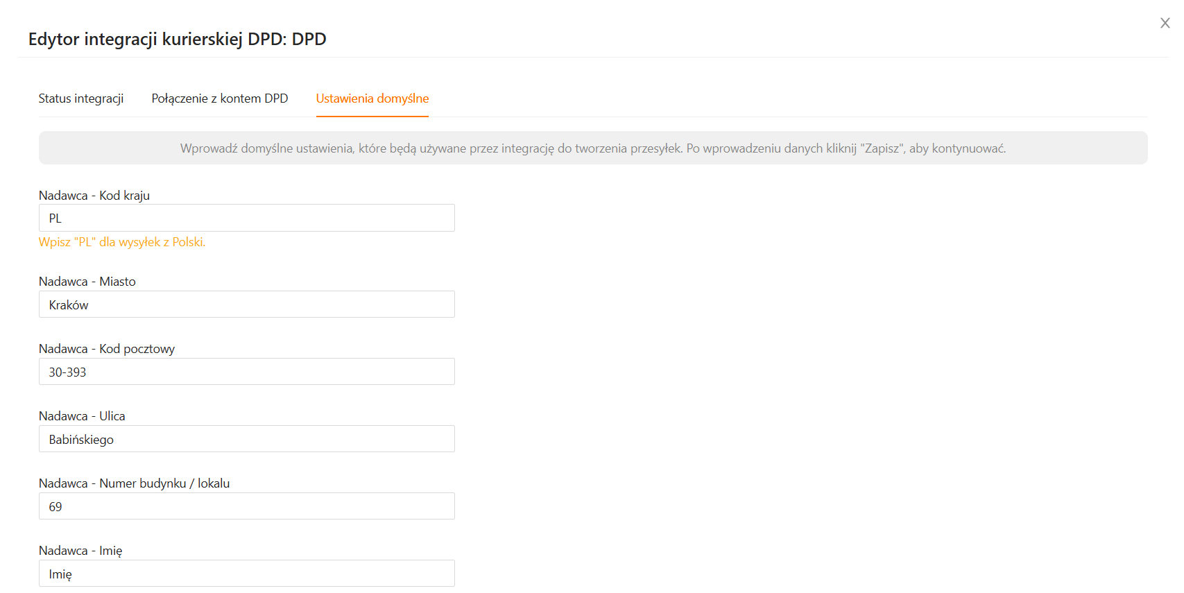 W następnym kroku wprowadź domyślne ustawienia, które będą używane przez integrację do tworzenia przesyłek. Po wprowadzeniu danych kliknij Zapisz, aby kontynuować.