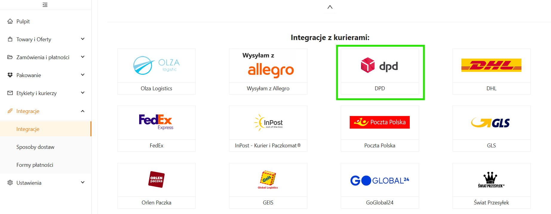 Aby dodać nową lub kolejną integrację z kurierem DPD przejdź do zakładki Integracje – Integracje. Odszukaj kafelek z logotypem DPD (sekcja Integracje z kurierami) i kliknij, aby uruchomić kreator.