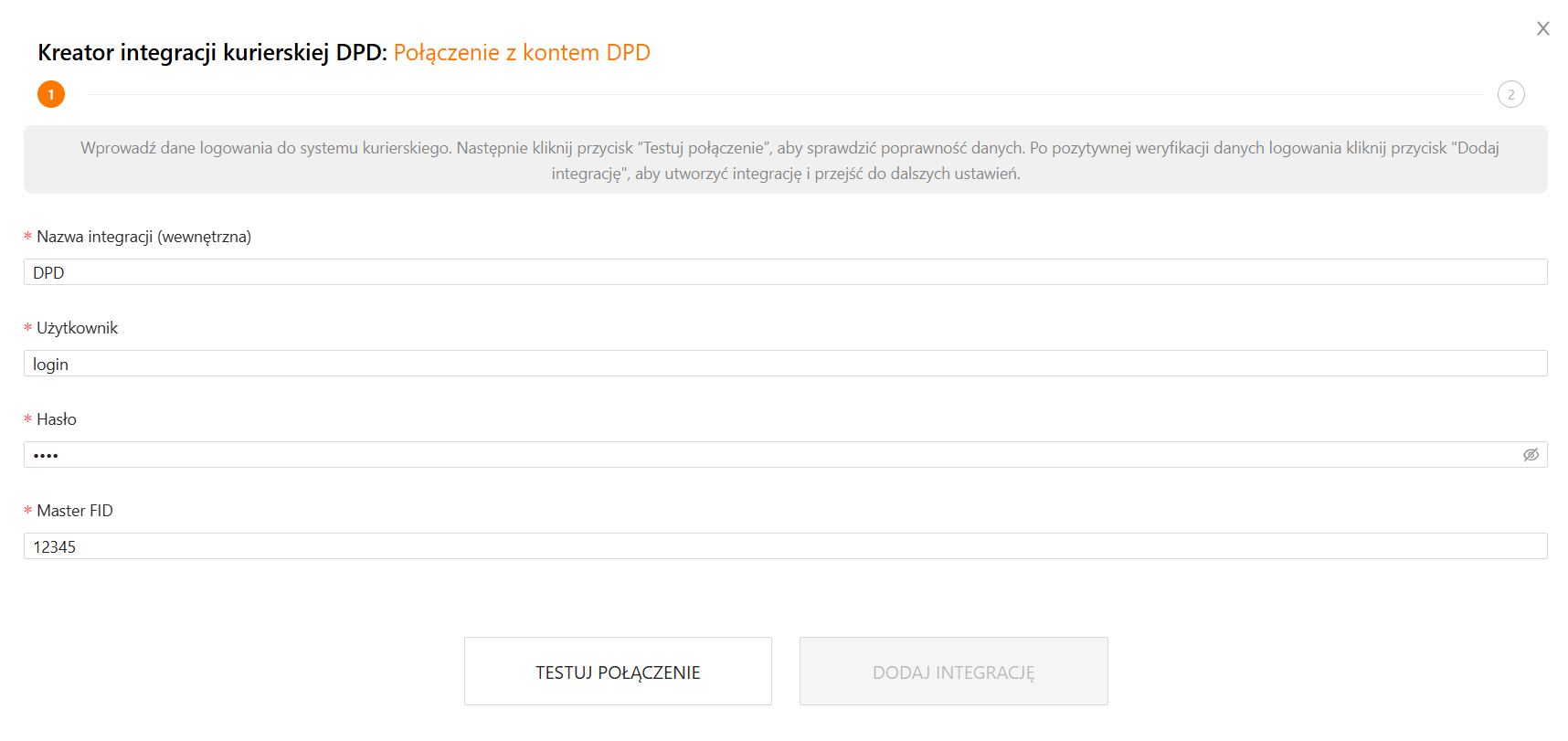 W pierwszym kroku kreatora podaj dane niezbędne do połączenia z systemem kuriera. W razie wątpliwości skontaktuj się ze swoim opiekunem konta DPD.