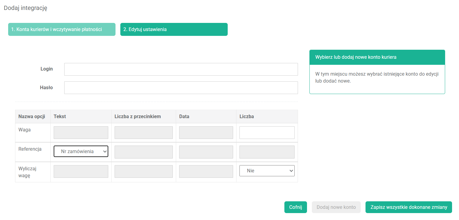 - referencja – informacje o zamówieniu umieszczane na etykiecie kurierskiej. Dostępne opcje: Nazwa towaru, Kod towaru, Nr zamówienia, Kod oferty.