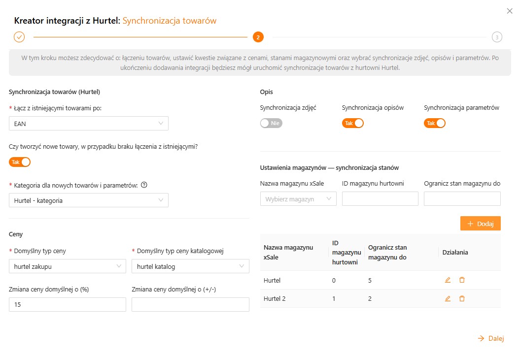 W drugim kroku uzupełniamy dane dotyczące synchronizacji towarów z hurtowni.