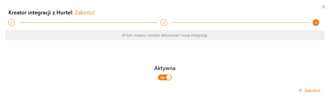 W ostatnim kroku mamy możliwość podjęcia decyzji czy integracja ma być od razu aktywna, czy ma zostać jako nieaktywna. Aby prawidłowo przejść cała konfigurację należy kliknąć Zakończ.