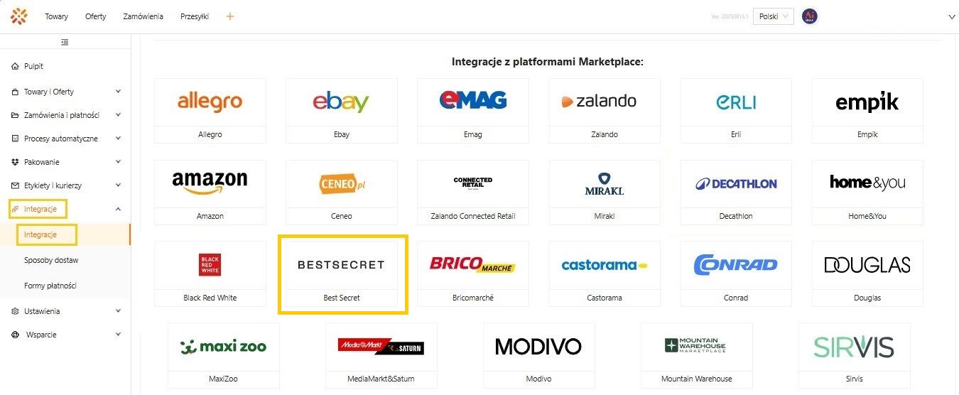 • W sekcji Integracje z platformami Marketplace należy wyszukać tej z logo i nazwą BestSecret