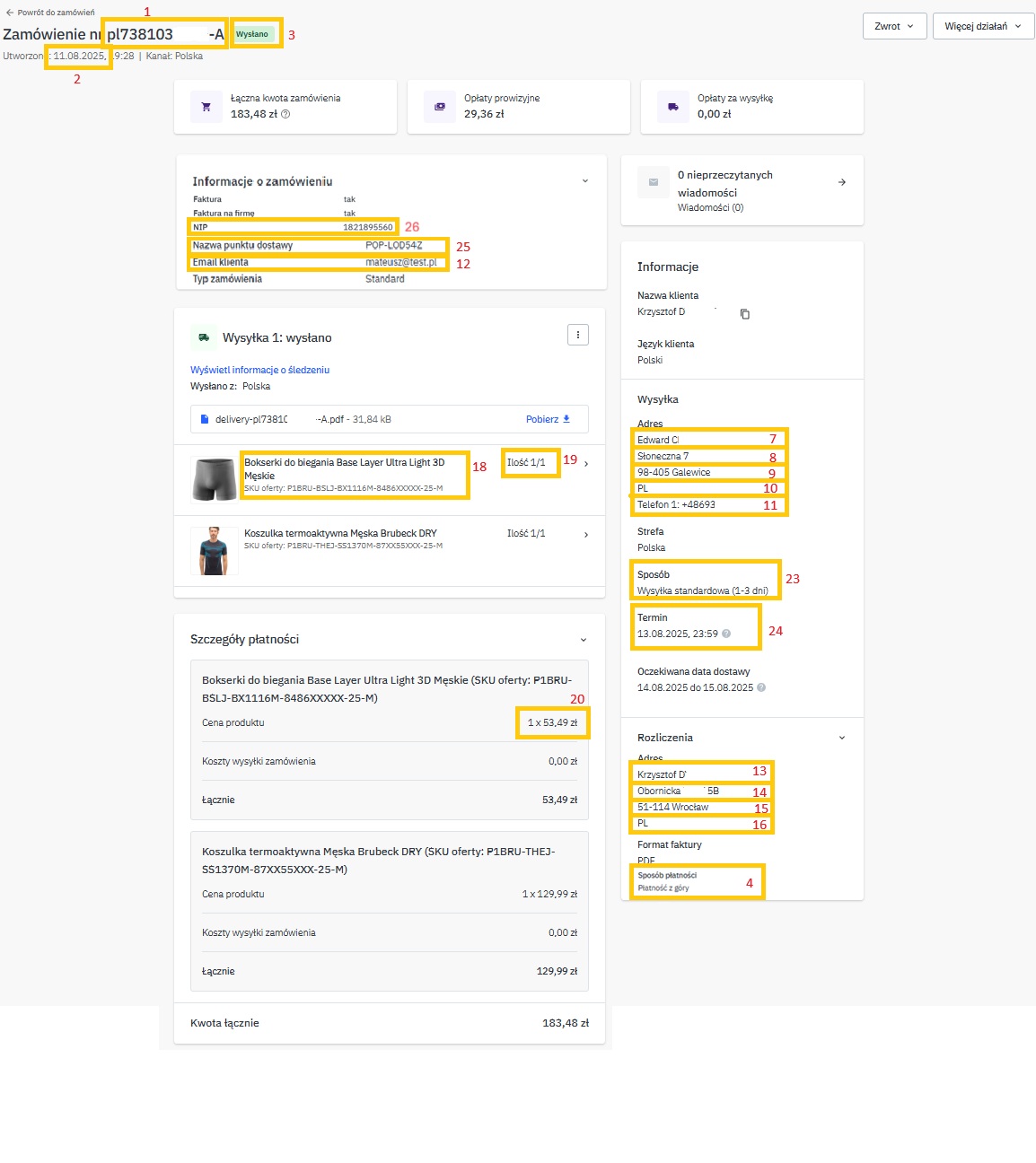 Edycja zamówienia -> Formularz zamówienia -> Pozycje zamówienia (Oferty) Dodatkowe informacje 39 Zamówienia -> Podgląd zamówienia -> Informacje -> Wysyłka Sposób 23
