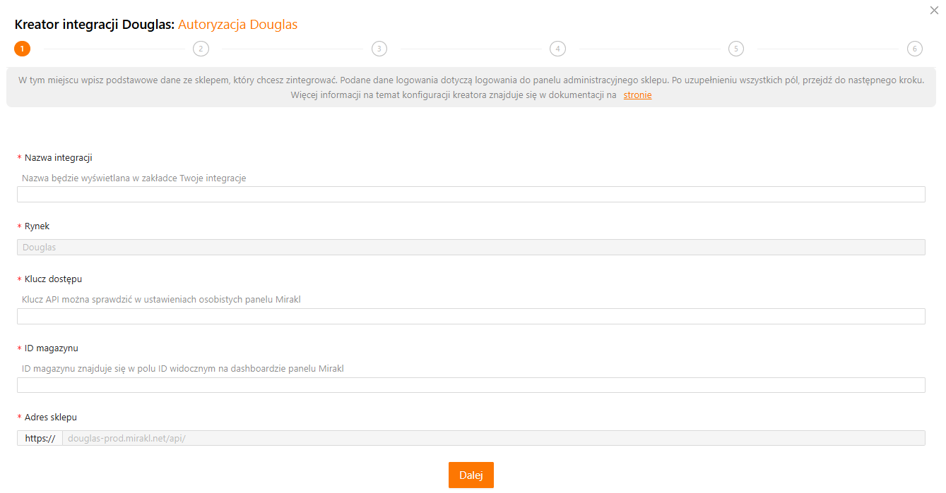 Z uwagi na to, że kreator jest dedykowany do integracji z Douglas, to pola Rynek i Adres sklepu są już automatycznie uzupełnione.
