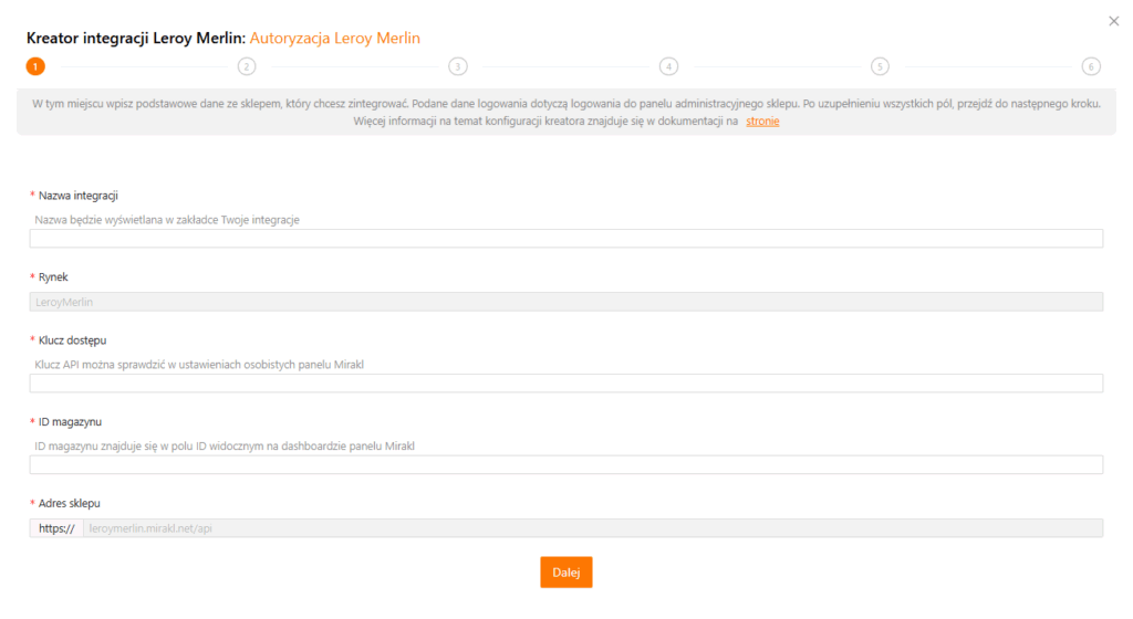 Z uwagi na to, że kreator jest dedykowany do integracji z Leroy Merlin, to pola Rynek i Adres sklepu są już automatycznie uzupełnione.