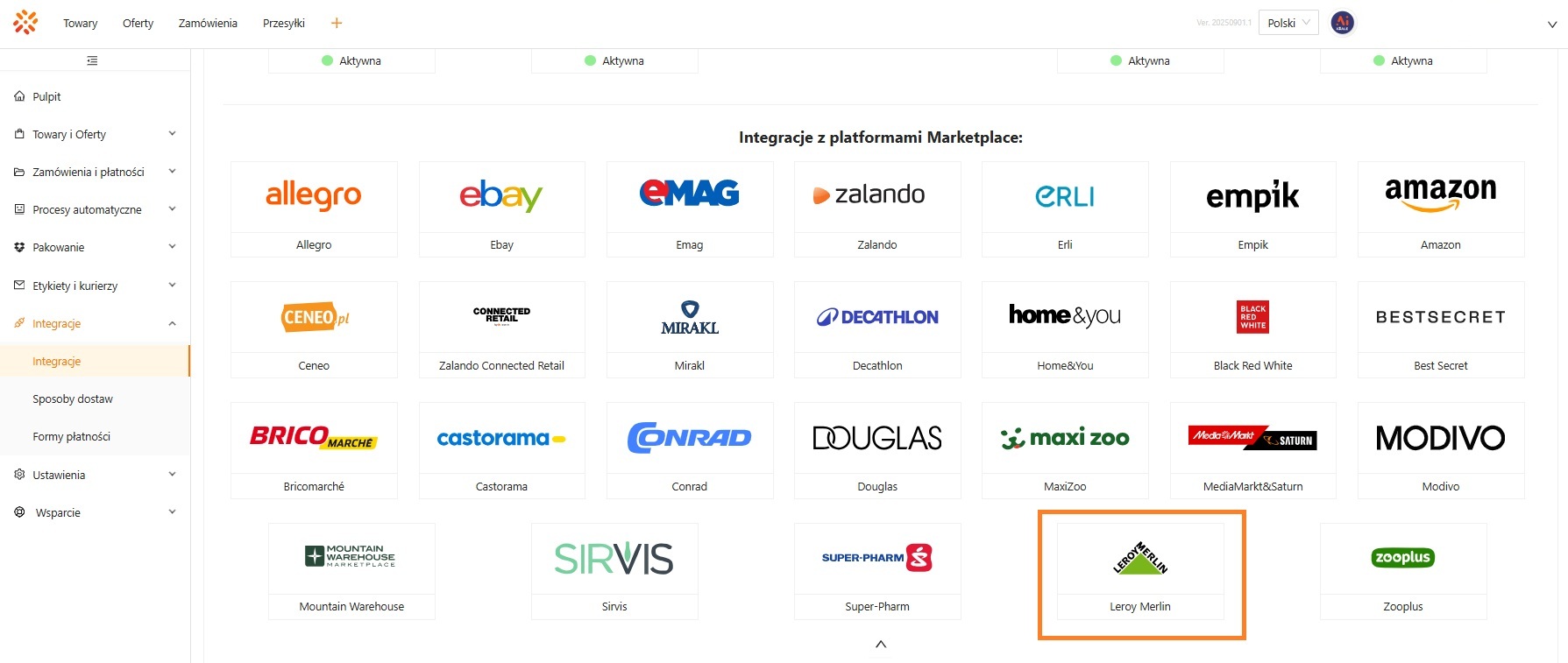 - W sekcji Integracje z platformami Marketplace należy wyszukać tej z logo i nazwą Leroy Merlin