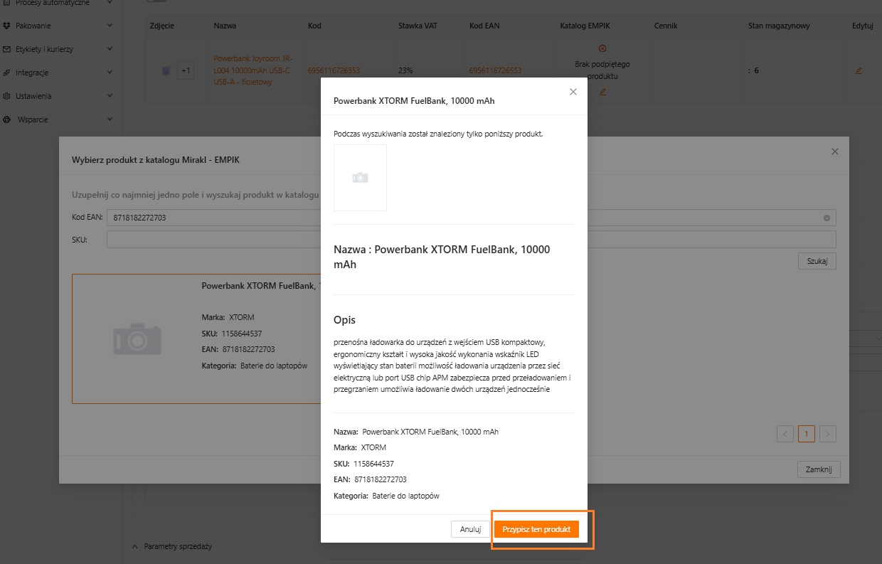 Tylko oferta z przypisanym produktem z katalogu będzie wysyłana do Mirakl i również tam zostanie utworzona.