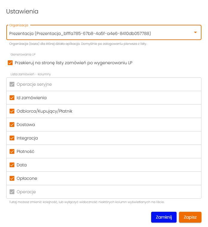 Po zalogowaniu do WMS Packing, w konfiguracji ustawień dostępna jest opcja umożliwiająca określenie, czy po wygenerowaniu listu przewozowego (LP) system ma automatycznie przekierowywać użytkownika na stronę listy zamówień. Dodatkowo, istnieje możliwość dostosowania widocznych kolumn w widoku listy zamówień.