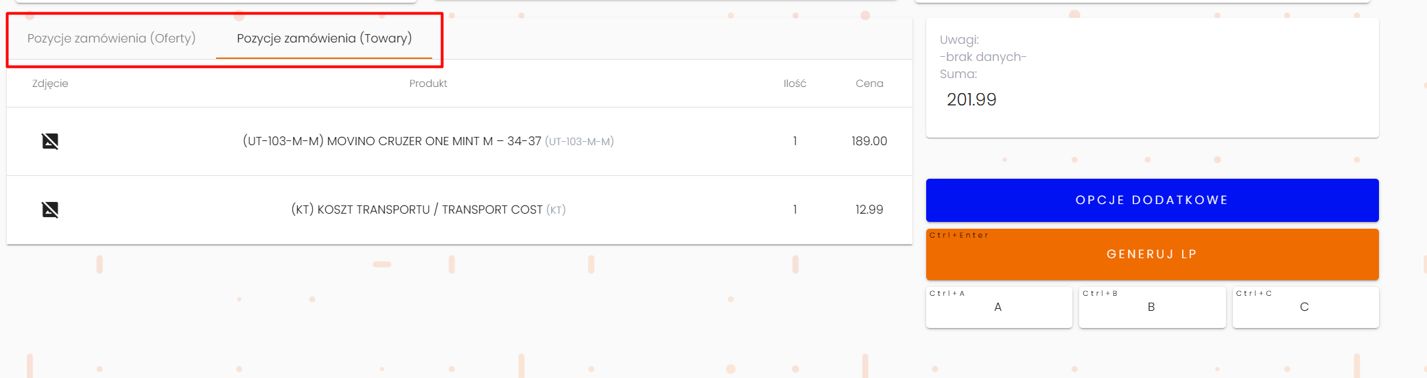 W danym zamówieniu istnieje również możliwość wyświetlania nazw towarów lub ofert przeznaczonych do spakowania. Zakładka umożliwia płynne przełączanie się pomiędzy tymi opcjami.