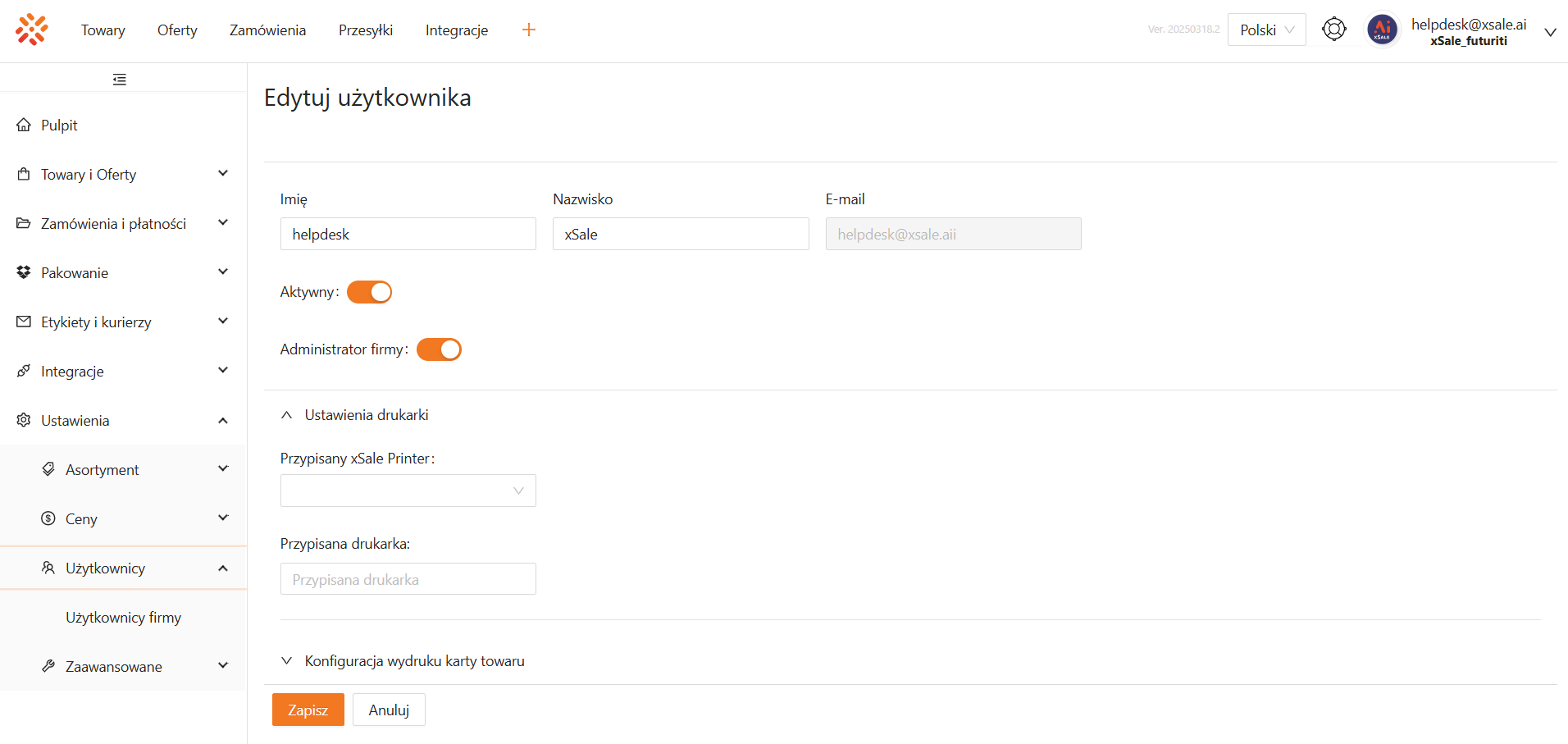 Przypisanie drukarki do operatora xSale/WMS Packing odbywa się w konfiguracji użytkownika w xSale. Przejdź do zakładki Ustawienia – Użytkownicy firmy i kliknij w nazwę użytkownika, aby przejść do edycji jego danych. Następnie rozwiń sekcję Ustawienia drukarki i wprowadź ustawienia w poniższych polach: