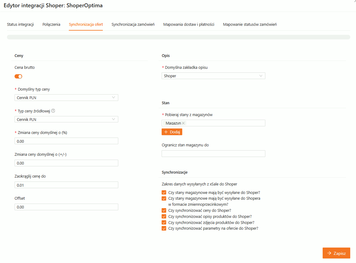 - W polu Stan ustawiamy magazyny z których integracja Shoper będzie pobierała stan magazynowy.