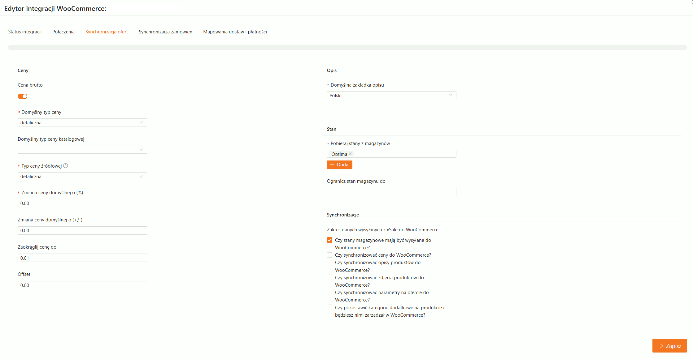 - W polu Stan ustawiamy magazyny, z których integracja WooCommerce będzie pobierała stan magazynowy.