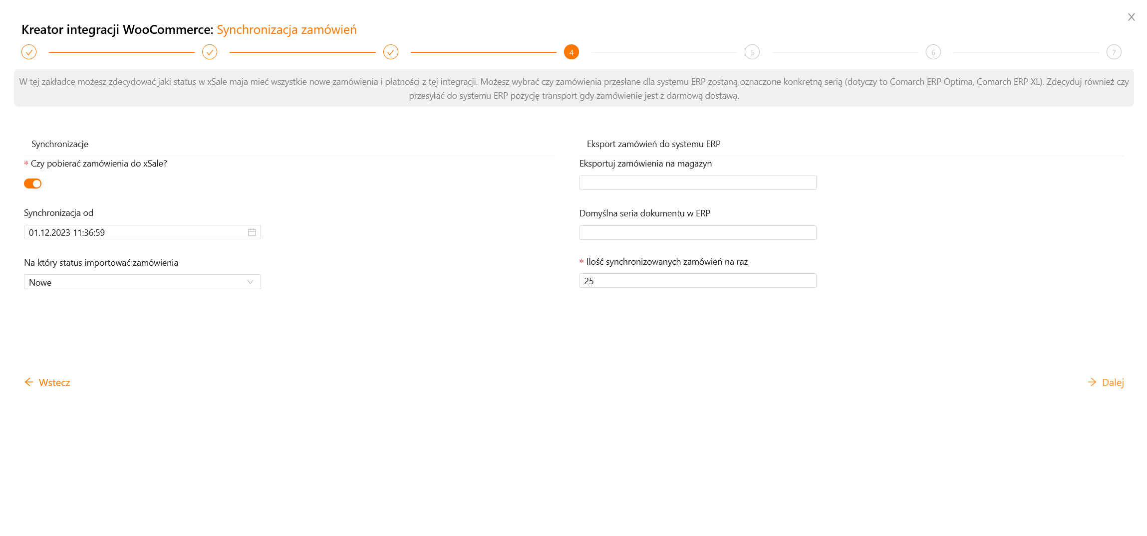 Ustawiamy opcje dotyczące synchronizacji zamówień z WooCommerce do xSale, a także do ERP.-