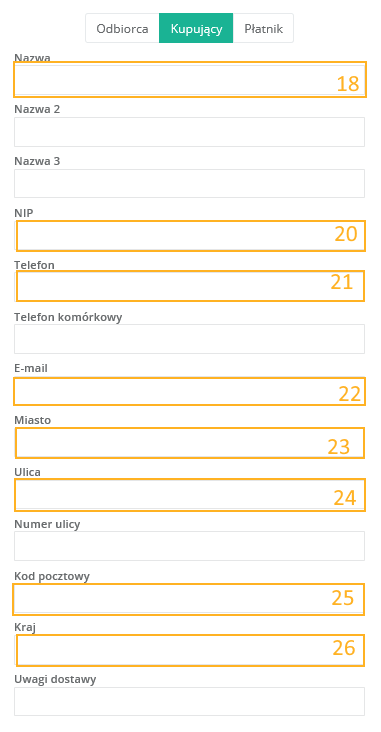 | Edycja zamówienia > Formularz adresu > Kupujący | Nazwa 2 | 19 | Sprzedaż na ERLI.pl -> Zamówienia -> Lista zamówień -> Szczegóły – > Dostawa -> Faktura | Firma | 16 | |