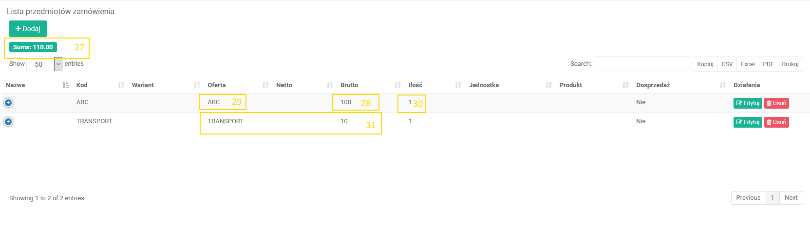 | Edycja zamówienia > Lista przedmiotów zamówienia | Suma | 27 | Sprzedaż na ERLI.pl -> Zamówienia -> Lista zamówień -> Szczegóły – > Produkty | Razem do zapłaty | 15 | |