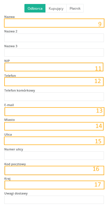 | Edycja zamówienia > Formularz adresu > Odbiorca | Nazwa 2 | 10 | Sprzedaż na ERLI.pl -> Zamówienia -> Lista zamówień -> Szczegóły – > Dostawa -> Dane odbiorcy | Firma | 7 | |