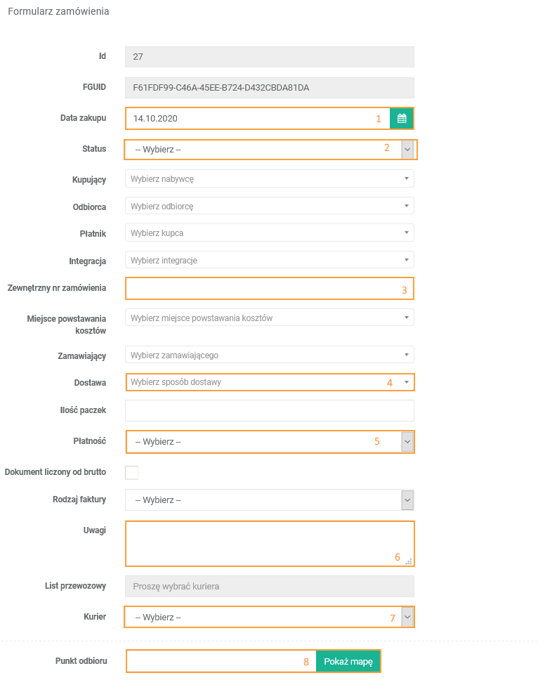 | Edycja zamówienia > Formularz zamówienia | Punkt Odbioru | 8 | Sprzedaż na ERLI.pl -> Zamówienia -> Lista zamówień -> Szczegóły -> Dostawa | Dostawa | 4 | W przypadku zamówień, gdzie wybrano dostawę do punktu odbioru. |