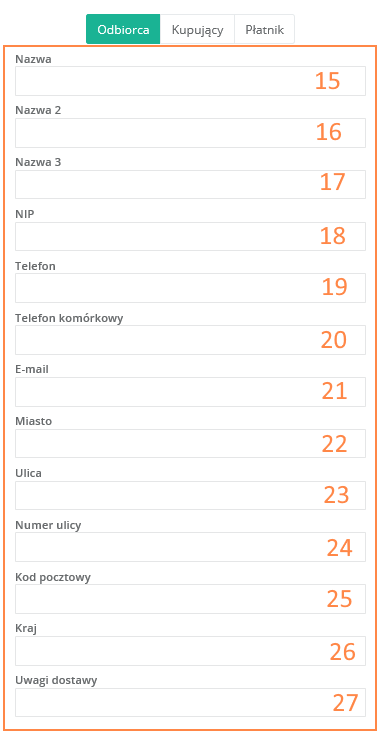 | Edycja zamówienia > Formularz adresu > Odbiorca | NIP | 18 | Lista zamówień > Operacje > Stwórz przesyłkę > Odbiorca > Edytuj adres odbiorcy | Nr podatkowy | 26 |