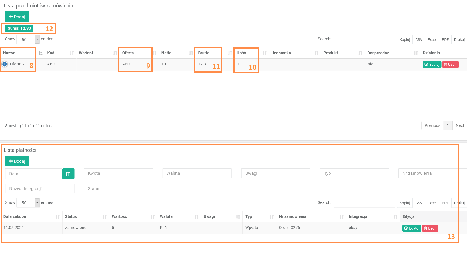 | Edycja zamówienia > Lista płatności | Płatność | 13 | Lista zamówień > Operacje > Stwórz przesyłkę | Status płatności | 6 |