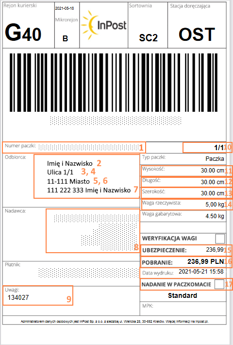 Poniższa tabela prezentuje zakres przesyłanych między xSale a InPost danych na przykładzie wygenerowanej etykiety.