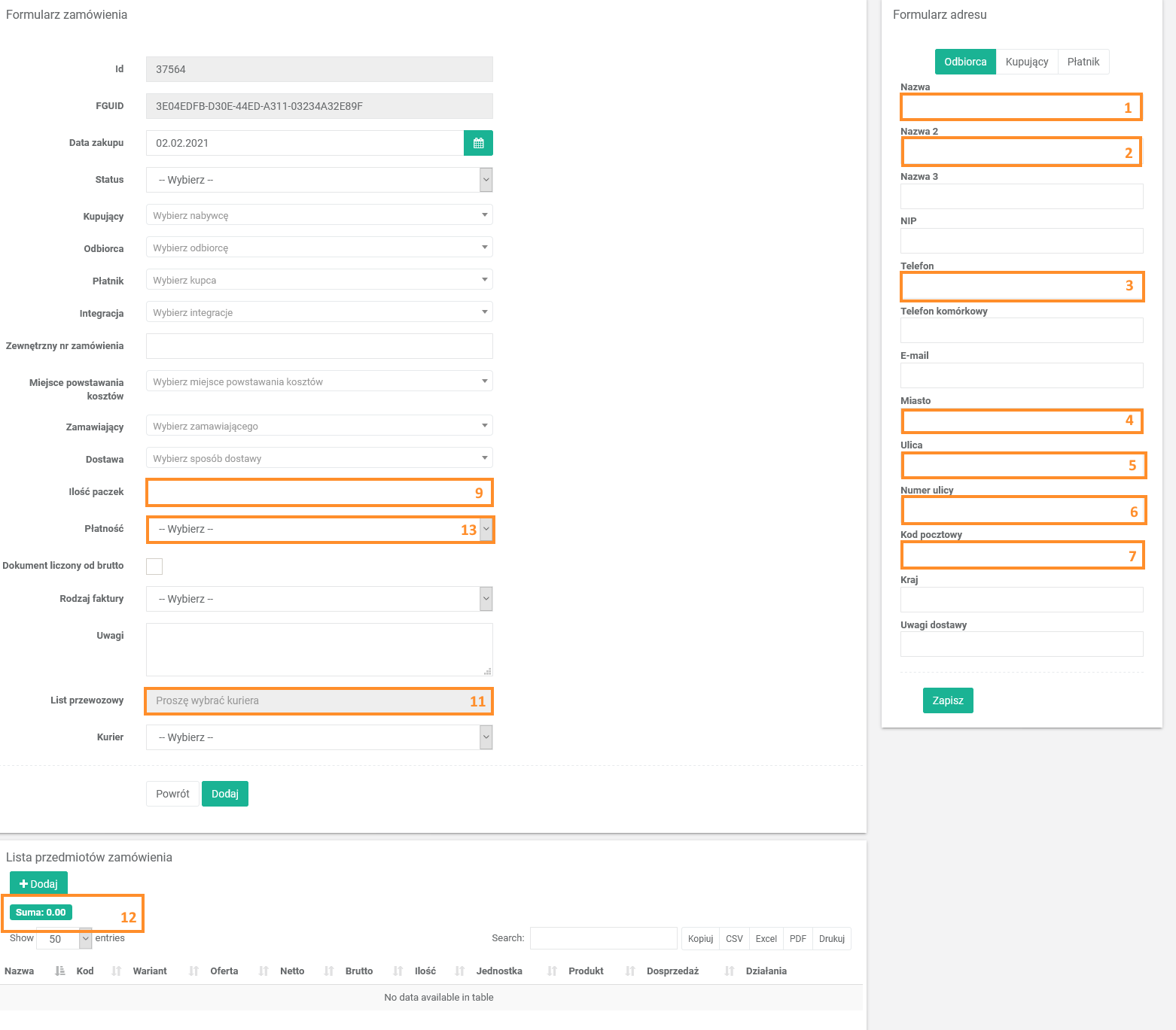 | Formularz zamówienia > Formularz adresu > Odbiorca | Telefon | 3 | Odbiorca | Numer telefonu | 7 | |