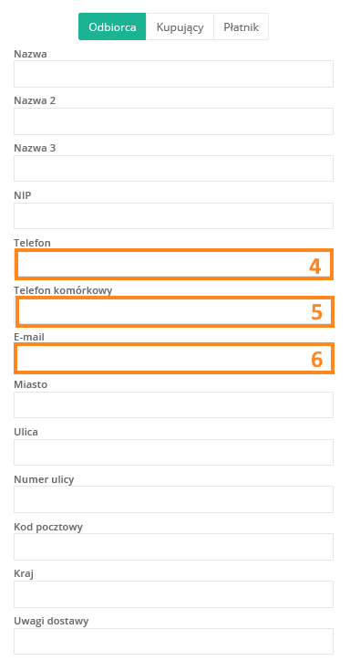 | Formularz zamówienia > Formularz adresu > Odbiorca | Telefon | 4 | Odbiorca | Telefon kontaktowy | 6 | Gdy po stronie, w danych Odbiorcy uzupełniony jest Telefon i Telefon komórkowy to pobierany jest numer z pola Telefon. |