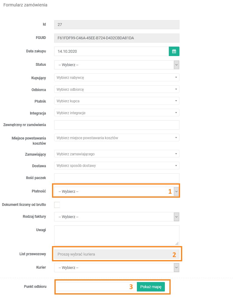 | Formularz zamówienia > Płatność | Płatność | 1 | Pobranie | Pobranie | 8 | Jeżeli na zamówieniu jest forma płatności zdefiniowana w integracji z kurierem jako forma COD, to na liście przewozowym podpowiada się kwota pobrania |