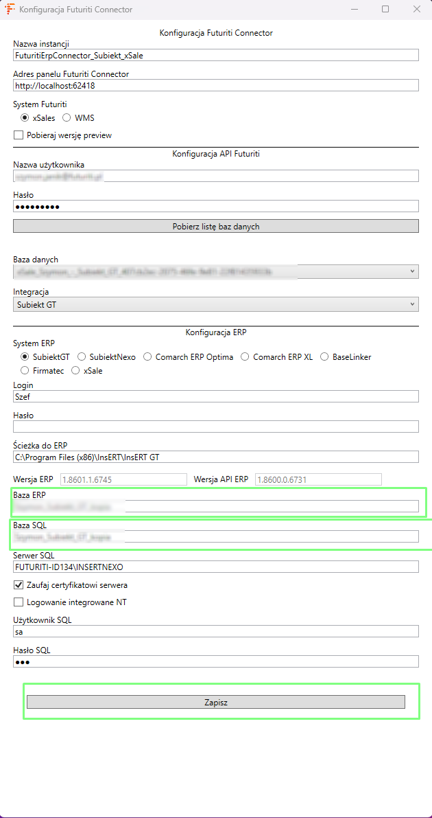 W przypadku zmiany bazy ERP systemu Subiekt GT, należy zaktualizować jej nazwę w obu wskazanych polach. Wartości muszą być identyczne z nazwami baz. Po wprowadzeniu zmian wystarczy zapisać konfigurację.