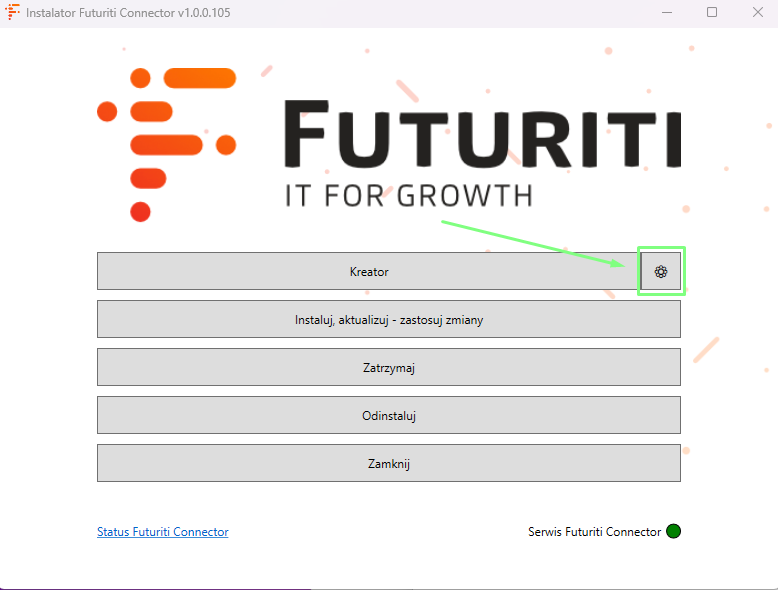 Po uruchomieniu Futuriti Connectora wybierz ikonę zębatki w prawym górnym rogu, aby przejść do ustawień Connectora.