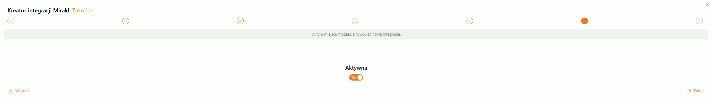 Przed ostatnim krokiem, w którym ustawiamy czy skonfigurowana integracja powinna być od razu włączona = aktywna, czy nie. W tym celu należy przesunąć suwak w widocznym polu.