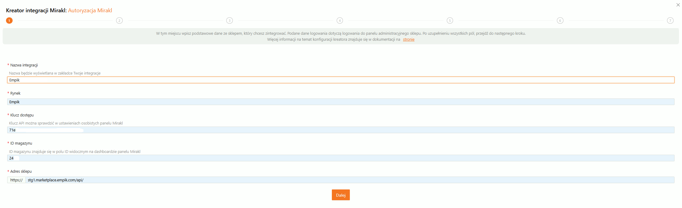 W otworzonym kreatorze integracji Mirakl należy uzupełnić wymagane pola oznaczone symbolem *, na tym etapie należy uzupełnić:
