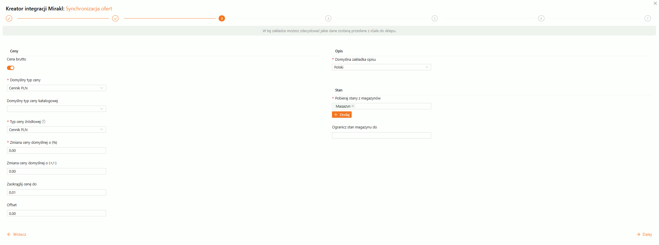 Przy synchronizacji ofert istnieje możliwość ustawienia parametrów, które dotyczą cen, opisu i stanów: