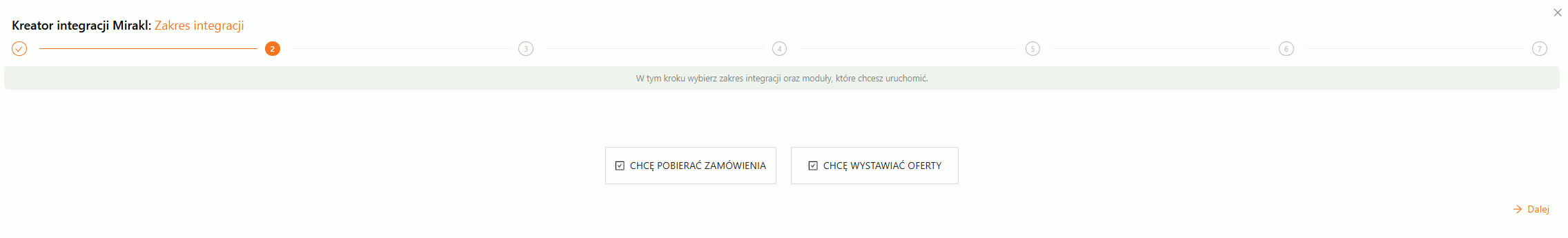 Należy wskazać czy chcemy pobierać zamówienia oraz wystawiać oferty. W zależności od wyboru, będą dostępne kolejne kroki. Zaklikany ptaszek oznacza wybór tej opcji.