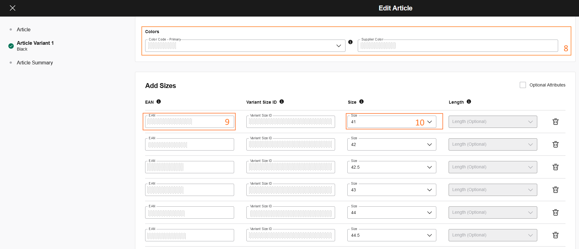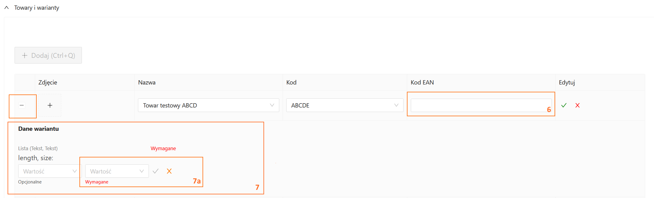 | Oferta -> Edycja -> Towary i warianty -> Edytuj | Wartość pola Size (wymagane) | 7a | Menu > Articles > Article Status Overview > Edit Article > Edit Article Variant | Size | 10 | |